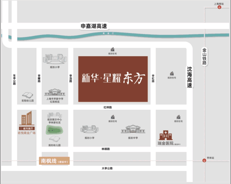 医疗配套:距离亭林医院约2公里,项目南侧有正在建设中的三甲级瑞金医院,金山院区一期项目,用地面积132亩,设置医疗床位400张,目前建设总投资约10.3亿元,南侧的体育公园配套设施也正在紧密的筹备中。