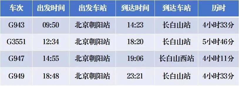 沈阳至佳木斯高速铁路沈阳至白河段,已于9月28日正式开通运营。从北京朝阳站乘坐高铁到长白山站,最快4小时33分钟可达。